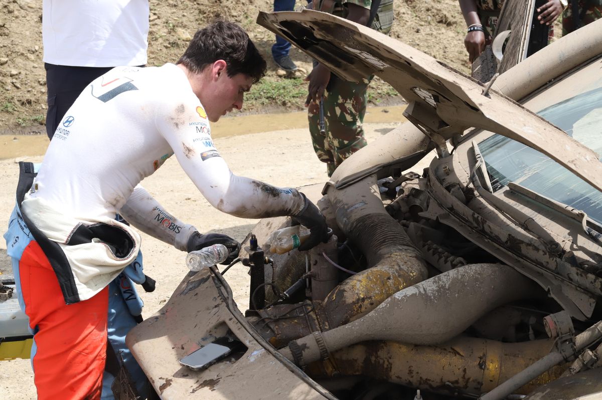 Adrien Fourmaux of the Hyundai Shell Mobis World Rally Team draws water from a muddy pool along the road at the Sleeping Warrior stage during Day Three of the 2026 World Rally Championship Safari Rally Kenya to use for cooling their car engine, as his co-driver Alexandre Coria and teammates Thierry Neuville and co-driver Martijn Wydaeghe continue with car repairs.