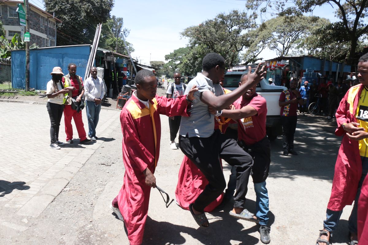 A youth playing Jesus is whipped and goes down during one of the Stations of the Cross as christians from Christ the King Cathedral in Nakuru commemorate The Way of the Cross on Good Friday, April 3