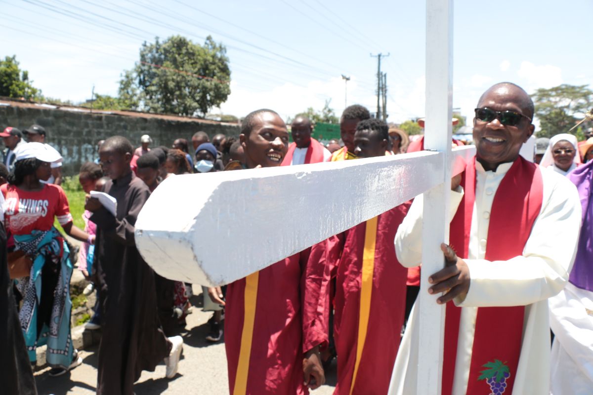 Nakuru Diocese Vicar General, Fr George Munyaka, carries the cross during the commemoration of The Way of the Cross on Good Friday, April 3