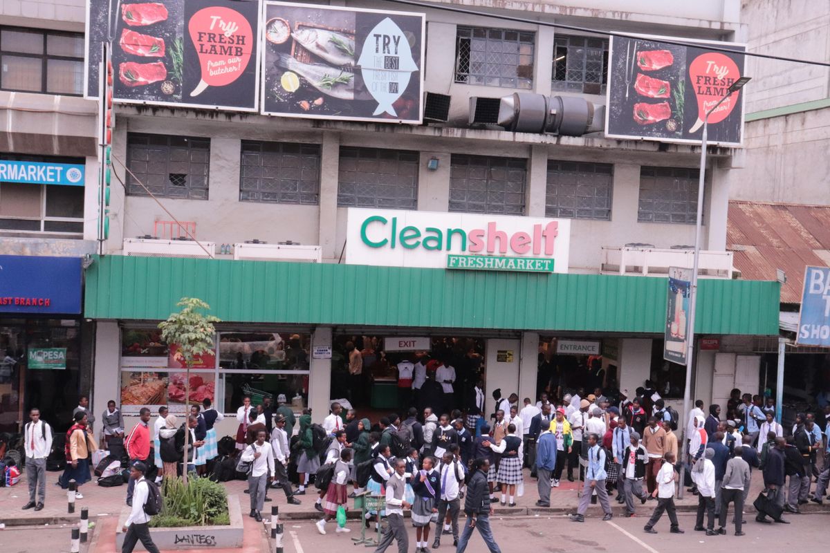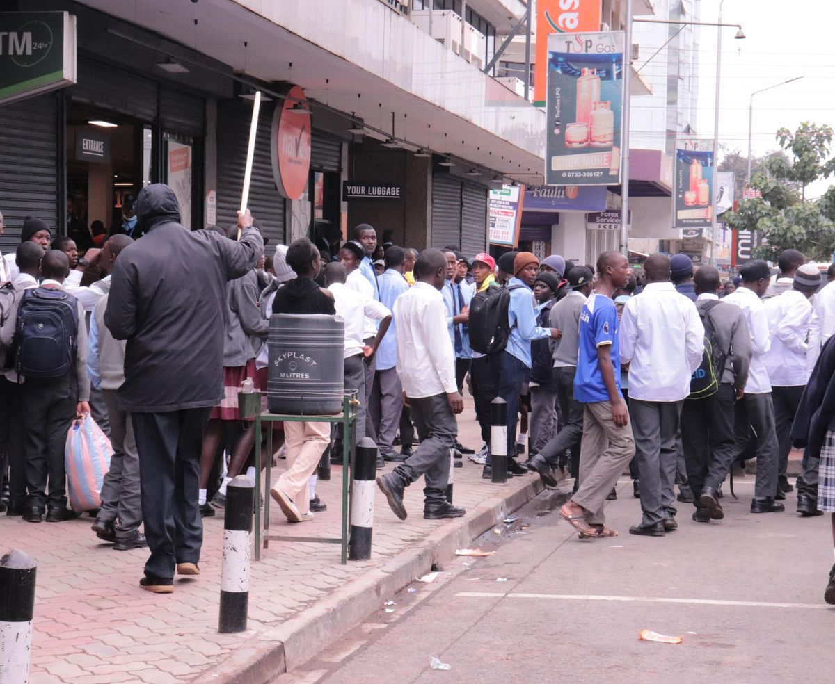 Students flock in front of Cleanshelf supermarket in Nakuru city after closing school on July 31, 2024.