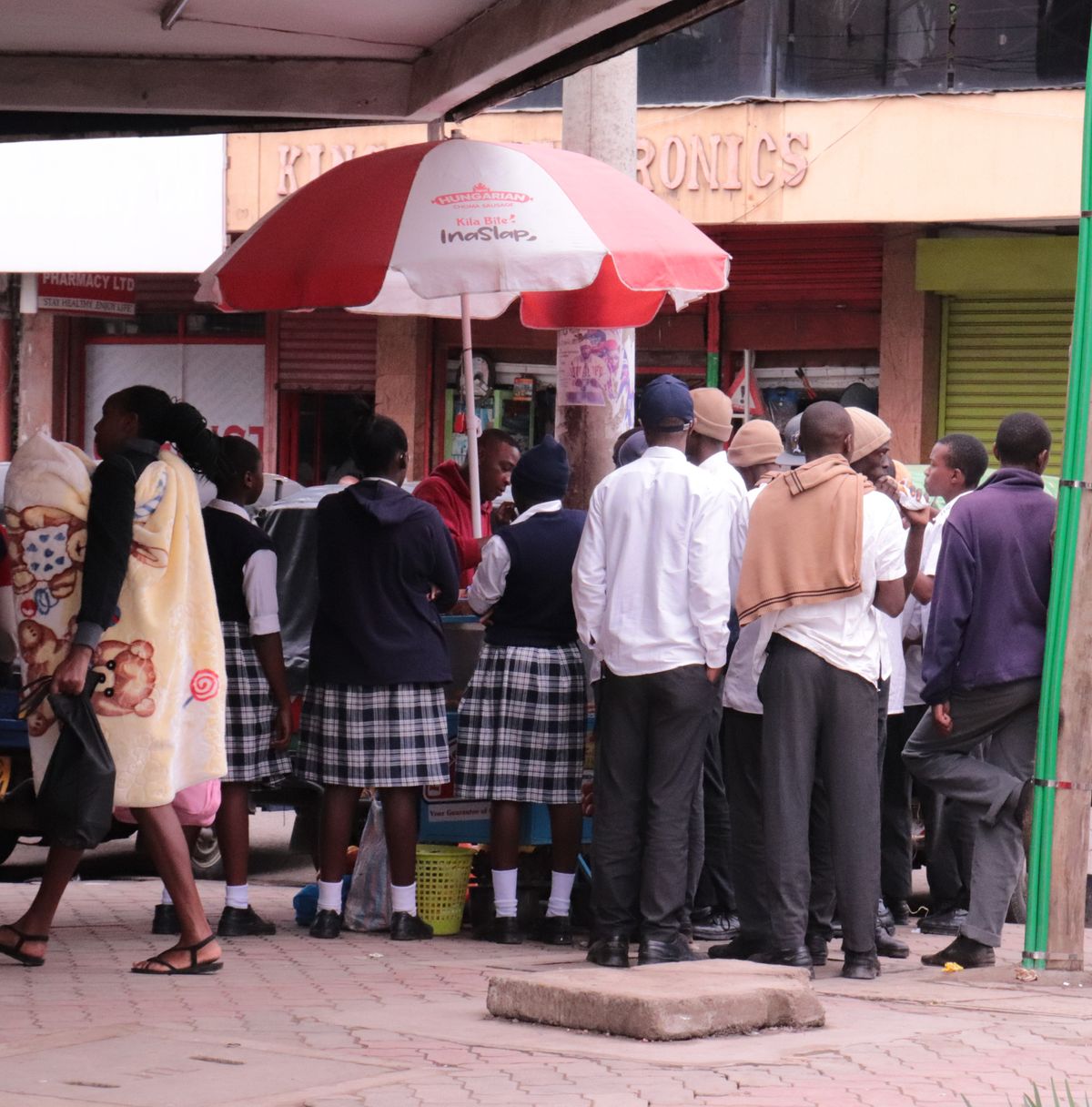 Students gather around smokie pasua vendor in Nakuru city after closing school on July 31, 2024.