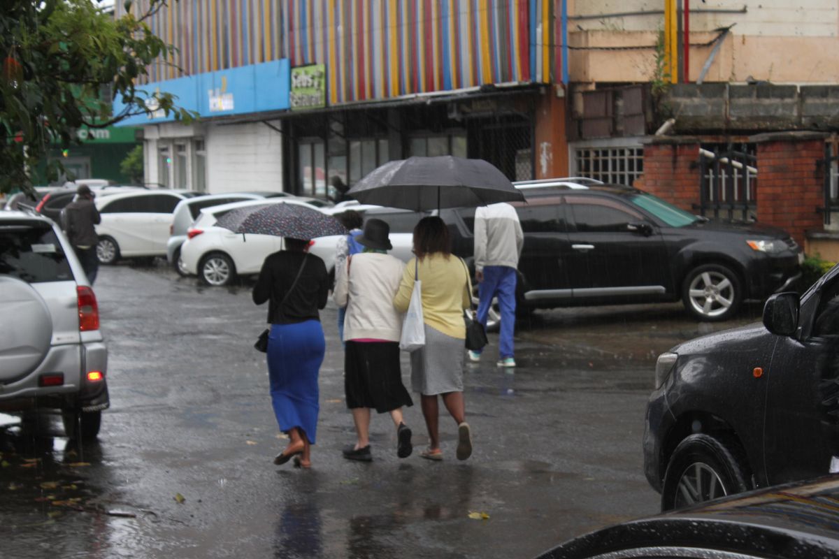 A group of women walk in the rain outside Sebs hotel on September 2,2025.