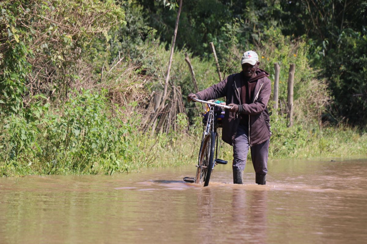 A man guides his bicycle through a flooded road in Mbaruk after heavy down pour. Photo taken on August 11,2025.