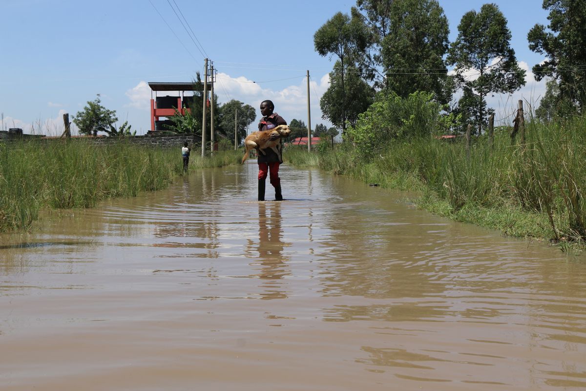 A man carrys his dog through a flooded road in Mbaruk to help is cross over. Photo taken on August 11,2025.