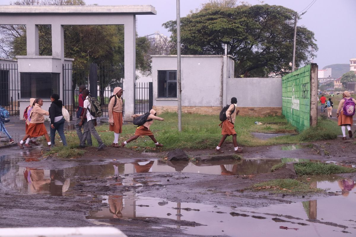 School children jump over a puddle of water outside Afraha stadium that was flooded after heavy rains on September 2,2025.